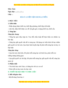Ngày dạy: ....../......./...... L p: ớ ... BÀI 47: LUY N Ệ T P Ậ CHUNG (2 TI T Ế ) I. M C Ụ TIÊU 1. Ki n t ế h c ứ - Nh n d ậ ng ạ đư c ợ kh i ố tr , kh ụ i ố l p ậ phư ng, kh ơ i ố h p ch ộ nh ữ t ậ - Liên h , nh ệ n ậ bi t ế đư c các ợ đ v ồ t ậ g n gũi ầ có d ng kh ạ i ố tr , ụ kh i ố c u ầ 2. Năng l c: ự Năng l c chung ự : + Năng l c ự giao ti p, ế h p ợ tác: Trao đ i ổ , th o ả lu n ậ để th c ự hi n ệ các nhi m ệ vụ h c ọ t p. ậ + Năng l c ự gi i ả quy t ế v n ấ đ ề và sáng t o: ạ S ử d ng ụ các ki n ế th c ứ đã h c ọ nh m ằ gi i ả quy t