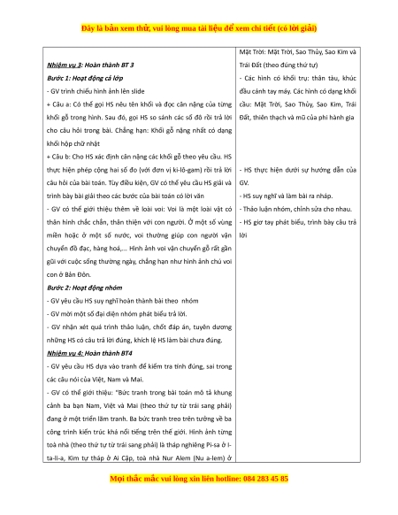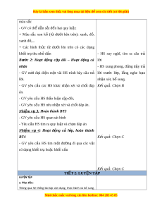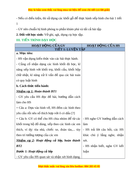 Đây là bản xem th , vu ử i lòng mua tài li u ệ đ xe ể m chi ti t (c ế ó l i ờ gi i ả ) - N u có đi ế u ki ề n, t ệ hì sử d ng các kh ụ ối g đ ỗ t ể h c hành x ự p hì ế nh cho bài 1 ti t ế 1 - GV nên chuẩn b hì ị nh phóng to ph n khám ầ phá và t t ấ c bài ả t p ậ 2. Đ i ố v i ớ h c s ọ inh: V ghi ở , sgk, d ng c ụ h ụ c t ọ p. ậ III. TI N Ế TRÌNH D Y Ạ H C Ọ HOẠT Đ N Ộ G C A Ủ GV HOẠT Đ N Ộ G C A Ủ HS TI T Ế 1: LUY N Ệ T P Ậ a. Mục tiêu: - HS v n d ậ ng ki ụ n ế th c ứ vào các bài th c ự hành. - C ng ủ cố nh n ậ d ng ạ các hình kh i ố đã h c, ọ kĩ năng x p ế hình v i ớ kh i ố tr , ụ kh i ố c u, ầ kh i ố h p ộ chữ nh t ậ , kĩ năng xử lí v n ấ đề qua các bài toán có quy lu t ậ hình b. Cách th c ứ ti n hàn ế h: Nhi m ệ v 1: