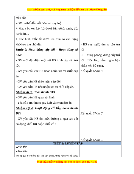 Đây là bản xem th , vu ử i lòng mua tài li u ệ đ xe ể m chi ti t (c ế ó l i ờ gi i ả ) màu s c ắ - GV có th d ể n s ẫ t ắ đ n ế hai quy lu t ậ : + Màu s c ắ xen kẽ (từ dư i ớ kên trên): xanh, đ , ỏ xanh đ ,... ỏ + Các hình th c ứ từ dư i ớ lên trên có các d ng ạ khối trụ thu nhỏ d n ầ