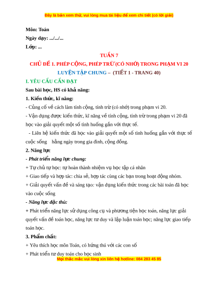 I. YÊU CẦU CẦN ĐẠT Sau bài h c, H ọ S có kh năng: ả 1. Ki n t ế h c, kĩ ứ năng: - C ng c ủ ố v cách ề làm tính c ng, t ộ ính tr ( ừ có nh ) ớ trong ph m ạ vi 20. - V n ậ d ng đ ụ ư c ợ ki n t ế h c, kĩ ứ năng v t ề ính c ng, ộ tính tr t ừ rong ph m ạ vi 20 đã h c ọ vào gi i ả quy t ế m t ộ số tình hu ng g ố n ắ v i ớ th c t ự . ế - Liên hệ ki n ế th c ứ đã h c ọ vào gi i ả quy t ế m t ộ số tình hu ng ố g n ắ v i ớ th c ự tế cu c ộ sống h ng