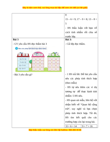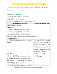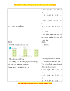 ọ sinh: SGK, vở ô li, nháp, ... III. CÁC HO T Ạ Đ N Ộ G D Y Ạ VÀ H C Ọ CHỦ Y U Ế Hoạt đ ng c ộ a g ủ iáo viên Hoạt đ ng c ộ a h ủ c s ọ inh A. KH I Ở Đ N Ộ G (3 phút) a. Mục tiêu: - T o h ạ ng kh ứ i ở đ h ể c ọ sinh vào bài m i ớ . - Xác định m c năng l ứ c ự hi n t ệ i ạ c a H ủ S - K t ế nối hi u bi ể t ế đã có v i ớ ki n t ế h c ứ m i ớ - C ng c ủ ố v phép ề c ng, t ộ rừ (có nh ) ớ trong ph m ạ vi 20. b. Cách ti n h ế ành: - GV tổ ch c ứ cho HS ch i ơ trò ch i ơ “ Ai nhanh, - HS nêu m t ộ phép tính c ng, ộ ai đúng ” trừ (có nh ) ớ trong ph m ạ vi 20. Đố b n ạ nêu đư c ợ các phép