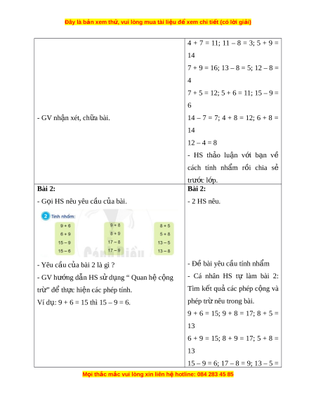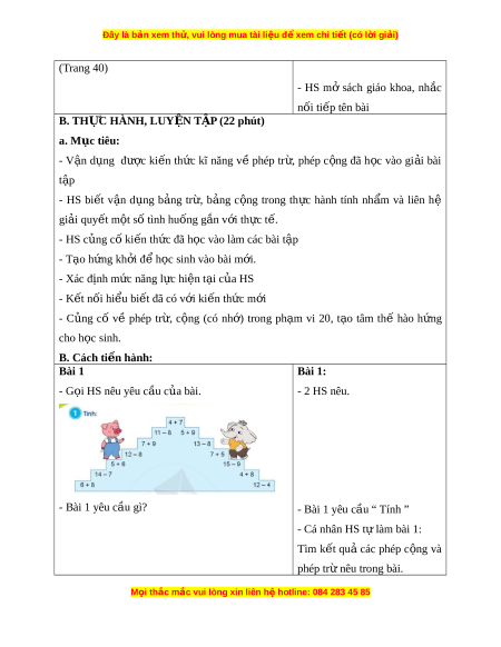 - HS mở sách giáo khoa, nh c ắ nối ti p t ế ên bài B. TH C Ự HÀNH, LUY N Ệ T P Ậ (22 phút) a. Mục tiêu: - V n ậ d ng ụ đư c ợ ki n ế th c ứ kĩ năng v ề phép tr , ừ phép c ng ộ đã h c ọ vào gi i ả bài t p ậ - HS bi t ế v n ậ d ng ụ b ng ả tr , ừ b ng ả c ng ộ trong th c ự hành tính nh m ẩ và liên hệ gi i ả quy t ế m t ộ số tình hu ng g ố n ắ v i ớ th c t ự . ế - HS c ng c ủ ố ki n t ế h c đã h ứ c ọ vào làm các bài t p ậ - T o h ạ ng kh ứ i ở đ h ể c ọ sinh vào bài m i ớ . - Xác định m c năng l ứ c ự hi n t ệ i ạ c a H ủ S - K t ế nối hi u bi ể t ế đã có v i ớ ki n t ế h c ứ m i ớ - C ng ủ cố về phép tr , ừ c ng ộ (có nh ) ớ trong ph m ạ vi 20, t o ạ tâm thế hào h ng ứ cho h c ọ sinh. B. Cách ti n hành ế : Bài 1 Bài 1: - G i ọ HS nêu yêu c u c ầ a ủ bài. - 2 HS nêu. - Bài 1 yêu c u gì ầ ? - Bài 1 yêu c u “ ầ Tính ” - Cá nhân HS t l ự àm bài 1: Tìm k t ế quả các phép c ng ộ và phép tr nêu t ừ rong bài. Mọi th c ắ m c