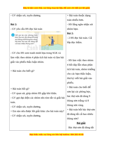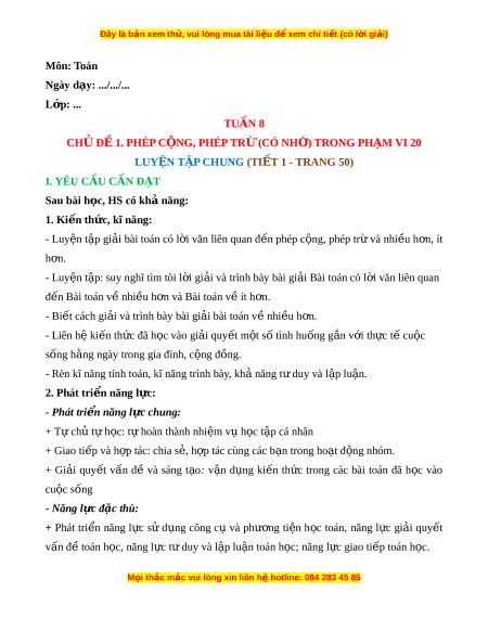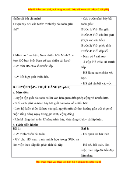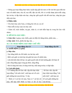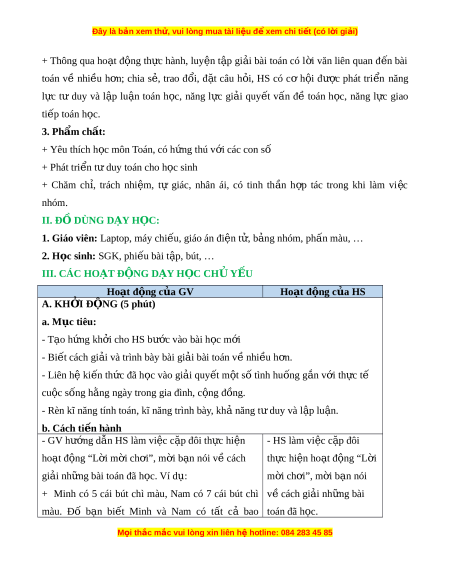 ử vui lòng mua tài li u ệ đ ể xem chi ti t ế (có l i ờ gi i ả ) + Thông qua ho t ạ đ ng ộ th c ự hành, luy n ệ t p ậ gi i ả bài toán có l i ờ văn liên quan đ n ế bài toán về nhi u ề h n; ơ chia s , ẻ trao đ i ổ , đ t ặ câu h i ỏ , HS có cơ h i ộ đư c ợ phát tri n ể năng l c ự tư duy và l p ậ lu n ậ toán h c, ọ năng l c ự gi i ả quy t ế v n ấ đề toán h c, ọ năng l c ự giao ti p t ế oán h c. ọ 3. Phẩm ch t ấ : + Yêu thích h c m ọ ôn Toán, có h ng ứ thú v i ớ các con số + Phát tri n t ể duy t ư oán cho h c s ọ inh + Chăm ch , ỉ trách nhi m