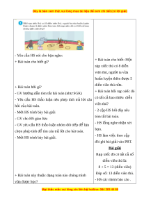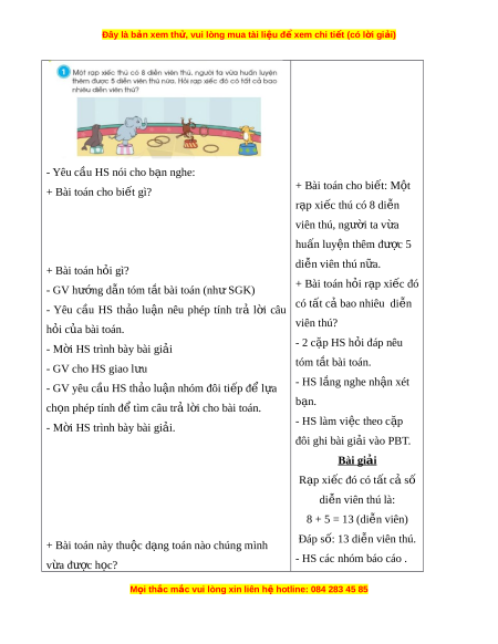 ử vui lòng mua tài li u ệ đ ể xem chi ti t ế (có l i ờ gi i ả ) - Yêu c u H ầ S nói cho b n nghe: ạ + Bài toán cho bi t ế : M t ộ + Bài toán cho bi t ế gì? r p xi ạ c t ế hú có 8 di n ễ viên thú, ngư i ờ ta v a ừ huấn luy n t ệ hêm đư c ợ 5 di n vi ễ ên thú n a. ữ + Bài toán h i ỏ gì? + Bài toán h i ỏ r p ạ xi c ế đó - GV hư ng d ớ n t ẫ óm t t ắ bài toán (nh SG ư K) có tất c bao nhi ả êu di n ễ - Yêu c u ầ HS th o ả lu n ậ nêu phép tính trả l i ờ câu viên thú? h i ỏ c a ủ bài toán. - 2 c p H ặ S h i ỏ đáp nêu - M i ờ HS trình bày bài gi i ả tóm t t ắ bài toán. - GV cho HS giao l u ư - HS l ng ắ nghe nh n xét ậ - GV yêu cầu HS th o l ả u n ậ nhóm đôi ti p đ ế ể l a ự b n. ạ ch n ọ phép tính đ t ể ìm câu tr l ả i ờ cho bài toán. - HS làm vi c t ệ heo c p ặ - M i ờ HS trình bày bài gi i ả . đôi ghi bài gi i ả vào PBT. Bài giải R p ạ xi c đó có t ế t ấ c s ả ố di n vi ễ ên thú là: 8 + 5 = 13 (di n vi ễ ên) Đáp số: 13 di n vi ễ ên thú. + Bài toán này thu c d ộ ng ạ toán nào chúng mình - HS các nhóm báo cáo . v a ừ đư c h ợ c? ọ Mọi th c ắ m c