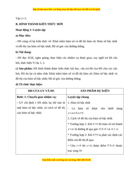 - Củng cố cách xác định hệ số góc và cách vẽ đồ thị của hàm số bậc nhất