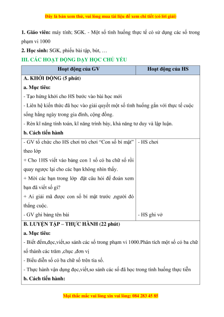 1. Giáo viên: máy tính; SGK. - Một số tình huống thực tế có sử dụng các số trong phạm vi 1000