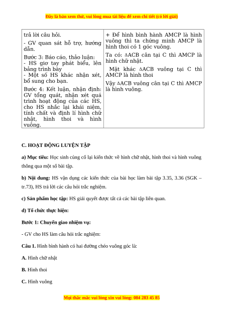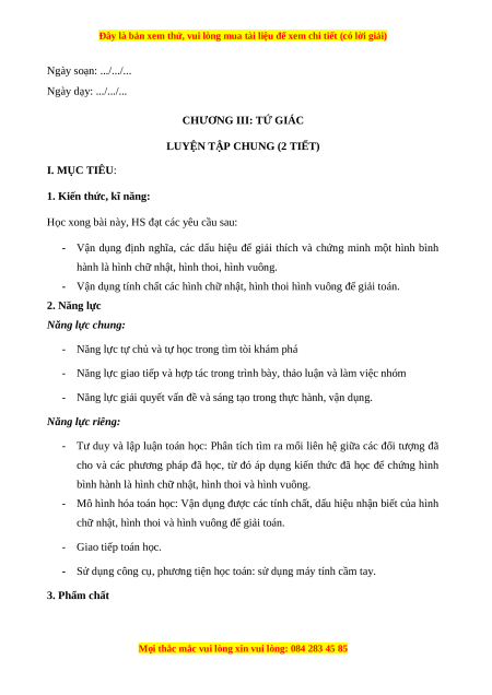 - Vận dụng tính chất các hình chữ nhật, hình thoi hình vuông để giải toán. 2. Năng lực