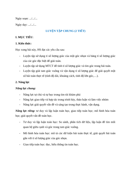 LUYỆN TẬP CHUNG (2 TIẾT) I. MỤC TIÊU: