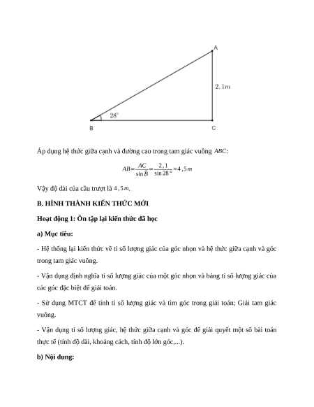 - Hệ thống lại kiến thức về tỉ số lượng giác của góc nhọn và hệ thức giữa cạnh và góc trong tam giác vuông.