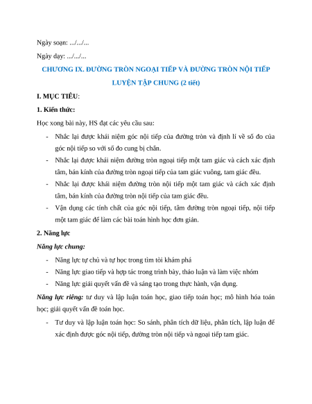 CHƯƠNG IX. ĐƯỜNG TRÒN NGOẠI TIẾP VÀ ĐƯỜNG TRÒN NỘI TIẾP