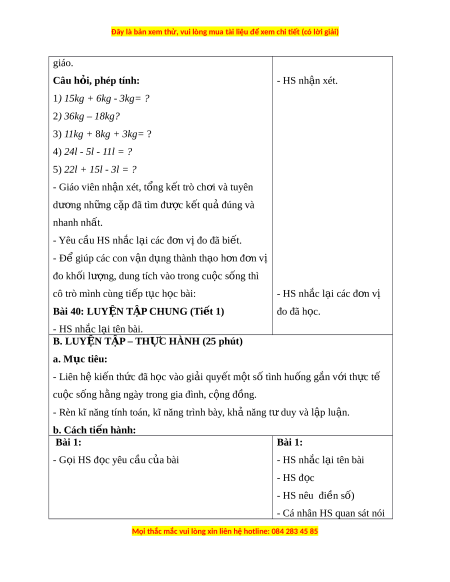 3) 11kg + 8kg + 3kg= ? 4) 24l - 5l - 11l = ? 5) 22l + 15l - 3l = ? - Giáo viên nh n ậ xét, tổng k t ế trò ch i ơ và tuyên dư ng ơ nh ng c ữ p ặ đã tìm được k t ế qu đúng và ả nhanh nhất. - Yêu c u H ầ S nh c l ắ i ạ các đ n ơ v đo đã bi ị t ế . - Đ gi ể úp các con v n d ậ ng t ụ hành th o ạ h n đ ơ n v ơ ị đo khối lư ng, dung t ợ ích vào trong cu c s ộ ng ố thì cô trò mình cùng ti p t ế c h ụ c ọ bài: - HS nh c l ắ i ạ các đ n ơ v ị Bài 40: LUY N Ệ TẬP CHUNG (Ti t ế 1) đo đã h c. ọ - HS nh c l ắ i ạ tên bài. B. LUY N Ệ T P Ậ – TH C Ự HÀNH (25 phút) a. Mục tiêu: - Liên h ki ệ n t ế h c ứ đã h c vào gi ọ i ả quy t ế m t ộ s t ố ình hu ng g ố n v ắ i ớ th c t ự ế cu c ộ sống h ng