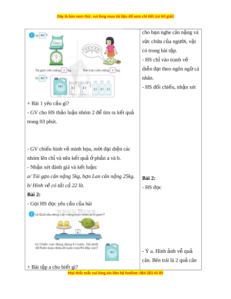 cho b n ạ nghe cân n ng ặ và sức ch a ứ c a ng ủ ư i ờ , v t ậ có trong bài t p. ậ - HS ch vào t ỉ ranh v ẽ di n đ ễ t ạ theo ngôn ng cá ữ nhân. - HS đ i ố chi u, ế nh n xét ậ + Bài 1 yêu c u gì ầ ? - GV cho HS th o l ả u n nhóm ậ 2 để tìm ra k t ế qu ả trong 03 phút. - GV chi u hì ế nh v m ẽ inh h a, ọ m i ờ đ i ạ di n các ệ nhóm lên chỉ và nêu k t ế qu ả ph ở n a và b. ầ - Nh n xét ậ đánh giá và k t ế lu n: ậ a/ Túi g o cân ạ n ng 5kg, b ặ n ạ Lan cân n ng 25kg. ặ Bài 2: b/ Hình v có t ẽ ất cả 22 lít. - HS đ c ọ Bài 2: - G i ọ HS đ c yêu ọ c u c ầ a bài ủ - Ý a. Hình nh ả v qu ễ ả cân. Bên trái là 2 qu cân ả + Bài t p a cho bi ậ t ế gì?
