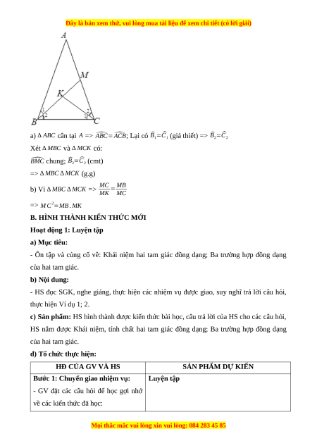 - Ôn tập và củng cố về: Khái niệm hai tam giác đồng dạng; Ba trường hợp đồng dạng của hai tam giác. b) Nội dung: