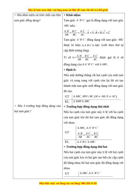 - Ôn tập và củng cố về: Khái niệm hai tam giác đồng dạng; Ba trường hợp đồng dạng
