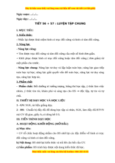 TIẾT 56 + 57 : LUYỆN TẬP CHUNG I. M C Ụ TIÊU: 1. Ki n t ế h c ứ : - Nhắc l i ạ đư c ợ khái ni m ệ hình có tr c ụ đ i ố x ng và ứ hình có tâm đ i ố x ng. ứ 2. Năng l c ự - Năng l c ri ự êng: + Tìm đư c ợ tr c ụ đ i ố x ng và t ứ âm đ i ố x ng c ứ a ủ m t ộ s hì ố nh đ n gi ơ n. ả + Khôi ph c ụ đư c ợ hình có tr c ụ đ i ố x ng ứ ho c ặ tâm đ i ố x ng ứ ( đ n ơ gi n) ả từ m t ộ phần cho trư c. ớ - Năng l c ự chung: Năng l c ự tư duy và l p ậ lu n ậ toán h c; ọ năng l c ự giao ti p ế toán h c ọ tự h c; ọ năng l c ự gi i ả quy t ế v n ấ đề toán h c, ọ năng l c ự tư duy sáng t o, năng l ạ c ự h p t ợ ác. 3. Ph m ẩ chất - Ph m ẩ ch t ấ : Bồi dư ng ỡ trí tư ng ở tư ng, ợ h ng ứ thú h c ọ t p, ậ ý th c ứ làm vi c ệ nhóm, ý th c