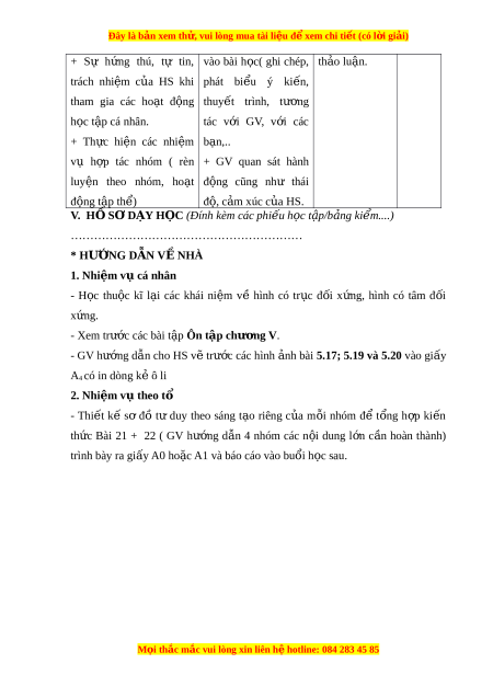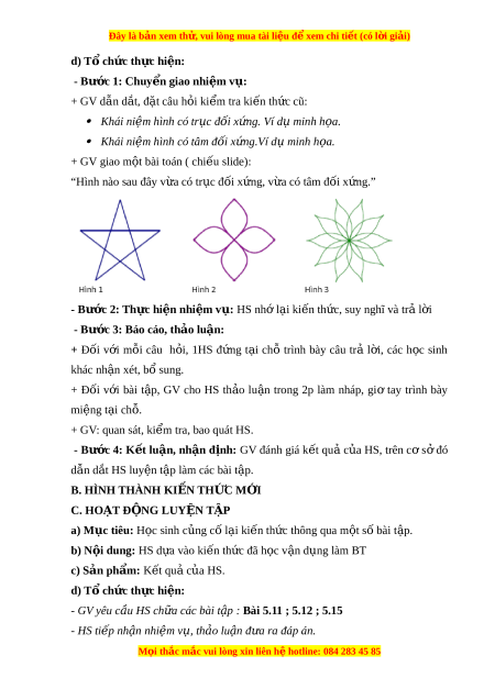 Đây là bản xem th , vu ử i lòng mua tài li u ệ đ xe ể m chi ti t ế (có l i ờ gi i ả ) Bài 5.11 : a) Nh ng hì ữ nh có tâm đ i ố x ng ứ : Cánh qu t ạ . b) Nh ng ữ hình có tr c ụ đ i ố x ng ứ : Tam giác đ u, cánh qu ề t ạ , trái tim, cánh di u. ề Bài 5.12: Hình b), c) có tr c đ ụ i ố x ng. ứ Bài 5.15 : Hình a) có tâm đ i ố x ng nh ứ ng ư không có tr c ụ đ i ố x ng ứ Hình b) có tr c đ ụ i ố x ng nh ứ ng không có t ư âm đ i ố x ng. ứ D. HOẠT Đ N Ộ G VẬN D N Ụ G a) M c ụ tiêu: H c ọ sinh th c ự hi n ệ làm bài t p ậ v n ậ d ng ụ để kh c ắ sâu ki n ế th c. ứ b) N i ộ dung: HS s d ử ng ụ SGK và v n d ậ ng ki ụ n t ế h c ứ đã h c đ ọ l ể àm bài t p. ậ c) Sản ph m ẩ : K t ế qu c ả a ủ HS.
