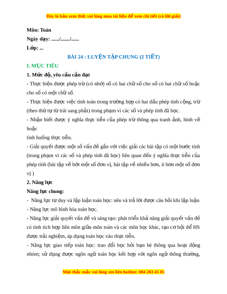 BÀI 24 : LUYỆN TẬP CHUNG (2 TI T Ế ) I. M C Ụ TIÊU 1. Mức đ , ộ yêu c u c ầ n đ ầ t ạ - Th c ự hi n ệ đư c ợ phép trừ (có nh ) ớ số có hai ch ữ s ố cho s ố có hai ch ữ s ố ho c ặ cho số có m t ộ ch s ữ ố. - Th c ự hi n ệ đư c ợ vi c ệ tính toán trong trư ng ờ h p ợ có hai d u ấ phép tính c ng, ộ trừ (theo th t ứ t ự t ừ rái sang ph i ả ) trong ph m ạ vi các s và phép t ố ính đã h c. ọ - Nh n ậ bi t ế đư c ợ ý nghĩa th c ự ti n ễ c a