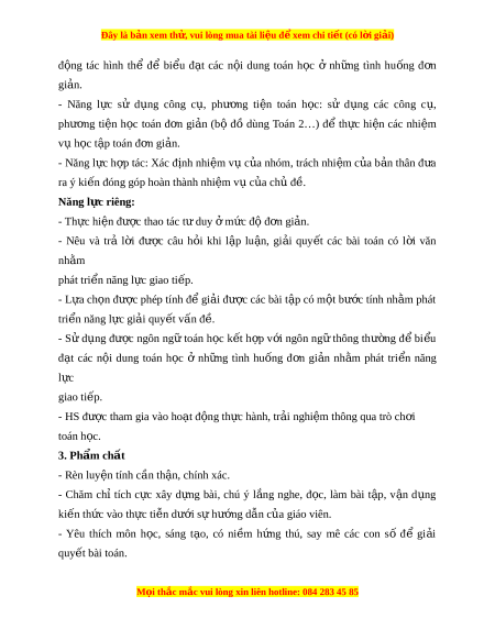 ả (bộ đồ dùng Toán 2…) để th c ự hi n ệ các nhi m ệ v h ụ c ọ t p t ậ oán đ n ơ gi n. ả - Năng l c ự h p ợ tác: Xác đ nh ị nhi m ệ v ụ c a ủ nhóm, trách nhi m ệ c a ủ b n ả thân đ a ư ra ý ki n đóng góp hoàn t ế hành nhi m ệ v c ụ a ủ ch đ ủ . ề Năng l c ri ự êng: - Th c hi ự n đ ệ ư c ợ thao tác t duy ư m ở c đ ứ đ ộ n gi ơ n. ả - Nêu và trả l i ờ đư c ợ câu h i ỏ khi l p ậ lu n, ậ gi i ả quy t ế các bài toán có l i ờ văn nh m ằ phát tri n năng l ể c gi ự ao ti p. ế - L a ch ự n đ ọ ư c ợ phép tính đ gi ể i ả đư c ợ các bài t p ậ có m t ộ bư c ớ tính nh m ằ phát tri n năng l ể c gi ự i ả quy t ế v n đ ấ . ề - Sử d ng ụ đư c ợ ngôn ng ữ toán h c ọ k t ế h p ợ v i ớ ngôn ng ữ thông thư ng ờ đ ể bi u ể đ t ạ các n i ộ dung toán h c ọ ở nh ng ữ tình hu ng ố đ n ơ gi n ả nh m ằ phát tri n ể năng l c ự giao ti p. ế - HS đư c t ợ ham gia vào ho t ạ đ ng t ộ h c ự hành, tr i ả nghi m ệ thông qua trò ch i ơ toán h c. ọ 3. Phẩm ch t ấ - Rèn luy n t ệ ính c n t ầ h n, chí ậ nh xác. - Chăm chỉ tích c c ự xây d ng ự bài, chú ý l ng ắ nghe, đ c, ọ làm bài t p, ậ v n ậ d ng ụ ki n t ế h c ứ vào th c t ự i n d ễ ư i ớ s h ự ư ng d ớ n c ẫ a ủ giáo viên. - Yêu thích môn h c, ọ sáng t o, ạ có ni m ề h ng