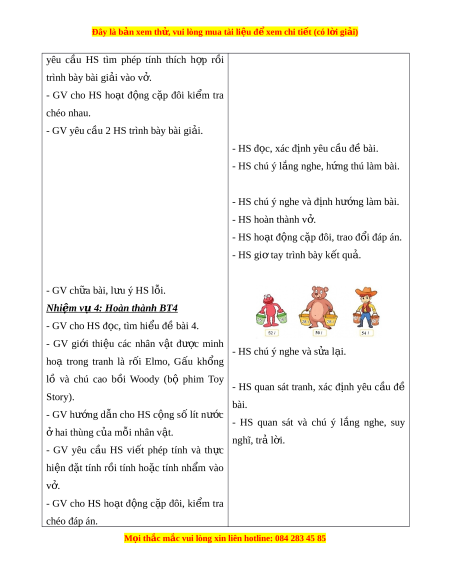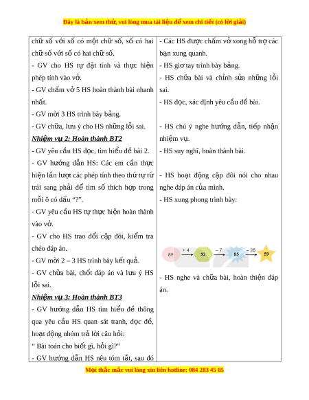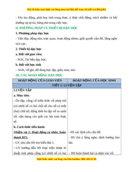 Đây là bản xem th , vu ử i lòng mua tài li u ệ đ xe ể m chi ti t (c ế ó l i ờ gi i ả ) - Yêu lao đ ng, ộ phát huy tính trung th c, ự ý th c ứ chủ đ ng, ộ trách nhi m ệ và b i ồ dư ng ỡ s t ự t ự in, h ng t ứ hú trong vi c h ệ c. ọ II. PHƯ N Ơ G PHÁP VÀ THI T Ế B D Ị Y Ạ H C Ọ 1. Phư ng ơ pháp d y h ạ c ọ - Vấn đáp, đ ng ộ não, tr c ự quan, ho t ạ đ ng ộ nhóm, gi i ả quy t ế v n ấ đ , ề l ng ắ nghe tích c c. ự 2. Thi t ế b d ị y h ạ c ọ a. Đ i ố v i ớ giáo viên: - SGK, Tài li u d ệ y h ạ c. ọ b. Đ i ố v i ớ h c s ọ inh - SGK, v ghi ở , đ dùng h ồ c t ọ p, ậ gi y m ấ àu, kéo. III. CÁC HO T Ạ Đ N Ộ G D Y Ạ H C Ọ HOẠT Đ N Ộ G C A Ủ GIÁO VIÊN HOẠT Đ N Ộ G C A Ủ H C Ọ SINH TI T Ế 1: LUY N Ệ T P Ậ LUYỆN T P Ậ a. Mục tiêu: - Ôn t p, ậ c ng ủ cố ki n ế th c ứ về phép trừ (có nh )