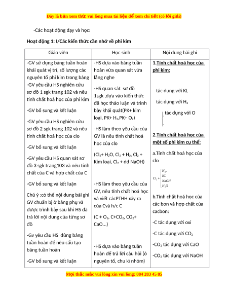 Hoạt động 1: I/Các kiến thức cần nhớ về phi kim Giáo viên Học sinh Nội dung bài ghi
