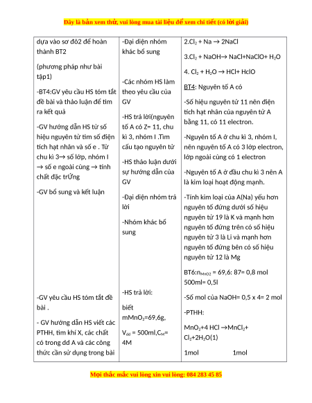 3.Cl2 + NaOH→ NaCl+NaClO+ H2O (phương pháp như bài 4. Cl tập1) 2 + H2O → HCl+ HclO -Các nhóm HS làm BT4: Nguyên tố A có
