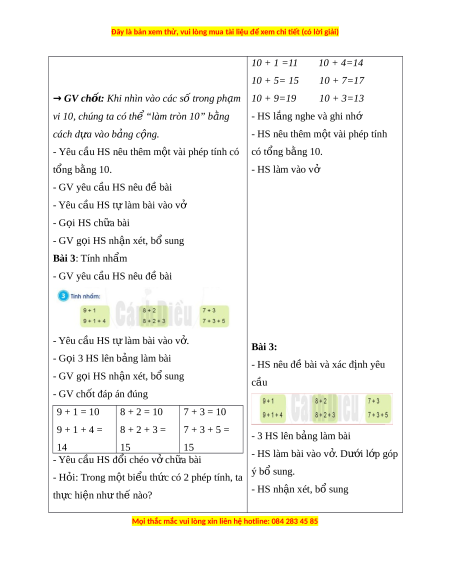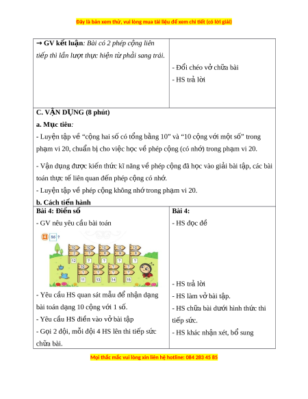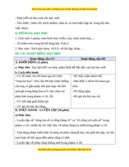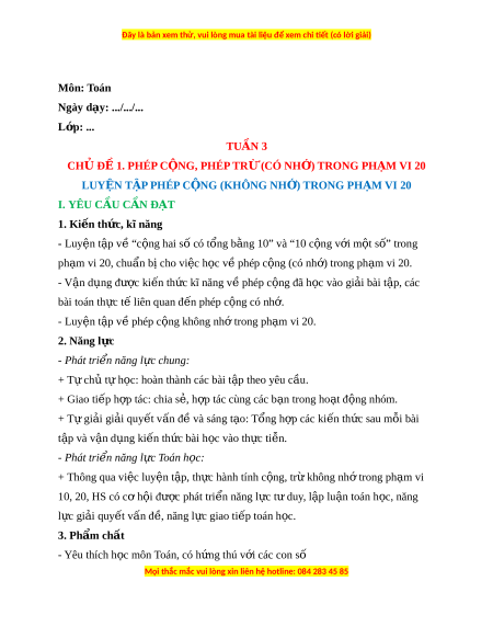 ọ hoàn thành các bài t p t ậ heo yêu c u. ầ + Giao ti p h ế p ợ tác: chia s , h ẻ p ợ tác cùng các b n t ạ rong ho t ạ đ ng nhóm ộ . + T gi ự i ả gi i ả quy t ế v n đ ấ và s ề áng t o: ạ T ng h ổ p các ợ ki n t ế h c s ứ au m i ỗ bài t p ậ và v n d ậ ng ụ ki n ế th c bài ứ h c vào ọ th c ự ti n. ễ - Phát tri n ể năng l c T ự oán h c: ọ + Thông qua vi c l ệ uy n t ệ p, t ậ h c ự hành tính c ng, t ộ r không nh ừ t ớ rong ph m ạ vi 10, 20, HS có cơ h i ộ đư c ợ phát tri n năng l ể c ự t duy ư , l p l ậ u n t ậ oán h c, năng ọ l c ự gi i ả quy t ế v n đ ấ , năng l ề c gi ự ao ti p t ế oán h c. ọ 3. Phẩm ch t ấ - Yêu thích h c m ọ ôn Toán, có h ng t ứ hú v i ớ các con số