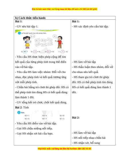 b) Cách th c ứ ti n hành ế : Bài 1: Bài 1: - GV nêu bài t p ậ 1. - HS xác đ nh yêu ị c u bài ầ t p. ậ - Yêu cầu HS th c ư hi n phép c ệ ng ộ đ t ể ìm k t ế qu c ả a ủ t ng ừ phép tính trong th đi ẻ n ề - HS làm vở bài t p ậ vào v bài ở t p. ậ - HS th o ả lu n t ậ heo nhóm, đ i ổ v ở - Yêu c u ầ HS làm vi c nhóm ệ : Đổi v cho ở cho nhau nêu k t ế qu . ả nhau, đ c ọ phép tính và k t ế quả tư ng ơ ng ứ - HS tham gia trò ch i ơ thi ghép v i ớ m i ỗ phép tính.