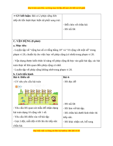 quả ghi trong bông hoa (GV l a ự ch n các ọ - HS l ng ắ nghe. phép tính trong ph m ạ vi 10, 20) - HS ghi tên bài vào v . ở - GV k t ế h p ợ gi i ớ thi u bài ệ - GV ghi tên bài lên b ng ả B. TH C Ự HÀNH - LUYỆN T P Ậ (20 phút) a) M c t ụ iêu: - Luy n t ệ p v ậ “c ề ng ộ hai s có t ố ng b ổ ng 10” và ằ “10 c ng v ộ i ớ m t ộ s ” ố trong ph m ạ vi 20, chu n b ẩ cho vi ị c h ệ c v ọ phép ề c ng ( ộ có nh ) ớ trong ph m ạ vi 20. - V n d ậ ng ụ đư c ki ợ n t ế h c ứ kĩ năng v phép c ề ng ộ đã h c ọ vào gi i ả bài t p, các ậ bài toán th c t ự l ế iên quan đ n ế phép c ng có nh ộ . ớ - Luyện t p v ậ phép c ề ng ộ không nh t ớ rong ph m ạ vi 20.