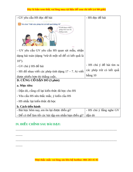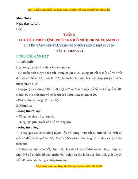Đây là bản xem th , vu ử i lòng mua tài li u ệ đ xe ể m chi ti t (c ế ó l i ờ gi i ả ) quả là 10”, chu n ẩ bị cho vi c ệ h c ọ về phép trừ ( có nh ) ớ trong ph m ạ vi 20 - Luy n ệ t p ậ về d ng ạ “10 trừ đi m t ộ s ” ố và “trừ đi m t ộ số để có k t ế quả là 10, chu n ẩ bị cho vi c ệ h c ọ v phép ề tr ( ừ có nh ) ớ trong ph m ạ vi 20. - Phát tri n các ể năng l c ự toán h c. ọ b. Cách ti n h ế ành: Bài 1: Bài 1: