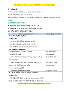 2. Giáo viên: SGV, SGK Toán 2, máy chi u, ế giáo án III. CÁC HO T Ạ Đ N Ộ G D Y Ạ H C Ọ Hoạt đ ng c ộ a G ủ V Hoạt đ ng c ộ a H ủ S A. KH I Ở Đ N Ộ G (5 phút) a. Mục tiêu: - T o h ạ ng kh ứ i ở đ h ể c ọ sinh vào bài m i ớ - Xác định m c năng l ứ c ự hi n t ệ i ạ c a H ủ S - K t ế nối hi u bi ể t ế đã có v i ớ ki n t ế h c ứ m i ớ b. Cách th c ứ ti n hàn ế h: - GV cho HS ch i ơ trò ch i ơ “Đ b ố n” ạ - HS ch i ơ trò ch i ơ - GV nêu lu t ậ ch i ơ - HS l ng ắ nghe - Lư t ợ 1: HS nêu m t ộ phép trừ trong ph m ạ vi 10 đ ố - HS ch i ơ trò ch i ơ b n ạ th c hi ự n. ệ - Lư t ợ 2: HS nêu m t ộ phép trừ (không nh ) ớ trong - HS tham gia ch i ơ ph m ạ vi 20 và đố b n ạ th c hi ư n ệ - HS l ng ắ nghe - Nh n xét ậ , đánh giá HS - GV d n d ẫ t ắ , gi i ớ thi u bài ệ m i ớ - HS ghi bài vào vở B. TH C Ự HÀNH – LUY N Ệ T P Ậ (22 phút) a. Mục tiêu - HS nh n ậ bi t ế đư c ợ phép trừ trong ph m ạ vi 20, d ng ạ 10 trừ đi m t ộ số và “ trừ đi m t ộ số để có k t ế M i