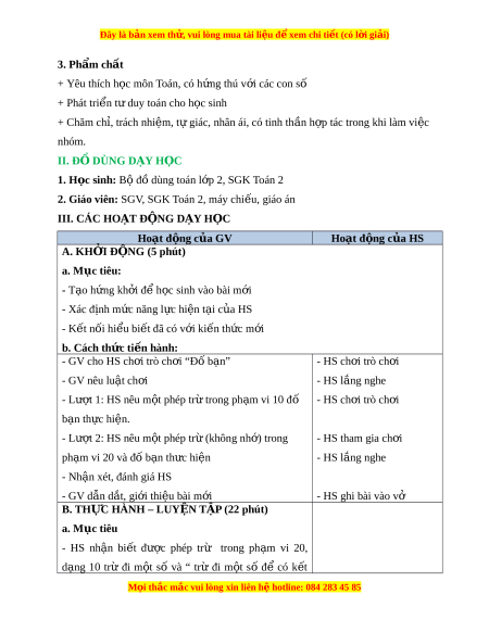 Đây là bản xem th , vu ử i lòng mua tài li u ệ đ xe ể m chi ti t (c ế ó l i ờ gi i ả ) 3. Phẩm ch t ấ + Yêu thích h c m ọ ôn Toán, có h ng ứ thú v i ớ các con số + Phát tri n t ể duy t ư oán cho h c s ọ inh + Chăm ch , t ỉ rách nhi m ệ , t gi
