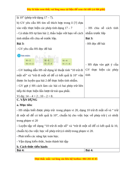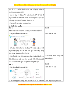 Đây là bản xem th , vu ử i lòng mua tài li u ệ đ xe ể m chi ti t (c ế ó l i ờ gi i ả ) là 10” (phép tr d ừ ng 17 – 7) ạ . b) GV yêu c u ầ HS tìm số thích h p ợ trong ô [?] d a ự vào việc th c ự hi n các ệ phép tính d ng 17 – 7 ạ - HS chia sẻ cách tính - Cá nhân HS t l ự àm bài 2, th o l ả u n ậ v i ớ b n v ạ cách ề nh m ẩ trư c ớ l p ớ tính nh m ẩ rồi chia sẻ trư c ớ l p. ớ Bài 3: Bài 3: - HS đ c ọ đ bài ề - GV yêu c u H ầ S đ c ọ đ bài ề - HS d a ự vào g i ợ ý c a ủ - GV hư ng ớ d n ẫ HS sử d ng ụ kĩ thu t ậ tính “10 tr ừ đi GV th c ự hi n ệ các phép m t