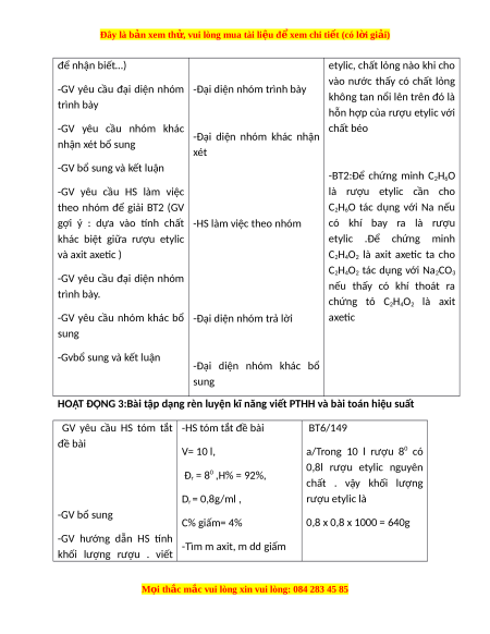 GV yêu cầu HS tóm tắt -HS tóm tắt đề bài BT6/149 đề bài V= 10 l, a/Trong 10 l rượu 80 có 0,8l rượu etylic nguyên Đr = 80 ,H% = 92%, chất . vậy khối lượng Dr = 0,8g/ml , rượu etylic là -GV bổ sung C% giấm= 4% 0,8 x 0,8 x 1000 = 640g