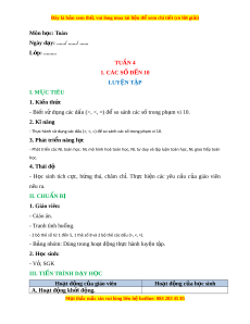 Ngày dạy: ....../ ....../ ...... L p: ớ ......... TUẦN 4 1. CÁC S Đ Ố ẾN 10 LUYỆN T P Ậ I. M C Ụ TIÊU 1. Ki n t ế h c ứ - Bi t ế sử d ng các ụ d u ( ấ >, <, =) đ s ể o sánh các s t ố rong ph m ạ vi 10. 2. Kĩ năng