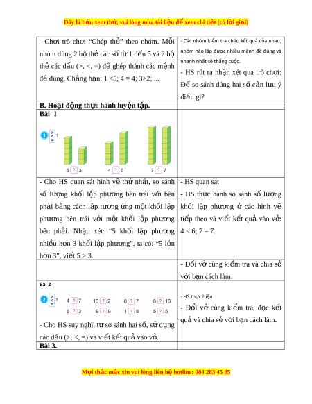 - Cho HS quan sát hình vẽ thứ nh t ấ , so sánh - HS quan sát số lư ng ợ khối l p ậ phư ng ơ bên trái v i ớ bên - HS th c ự hành so sánh số lư ng ợ ph i ả b ng ằ cách l p ậ tư ng ơ ng ứ m t ộ kh i ố l p ậ khối l p ậ phư ng ơ ở các hình vẽ phư ng ơ bên trái v i ớ m t ộ kh i ố l p ậ phư ng ơ ti p ế theo và vi t ế k t ế quả vào v : ở bên ph i ả . Nh n ậ xét: “5 kh i ố l p ậ phư ng ơ 4 < 6; 7 = 7. nhi u ề h n ơ 3 kh i ố l p ậ phư ng”, ơ ta có: “5 l n ớ h n ơ 3”, vi t ế 5 > 3. - Đối vở cùng ki m ể tra và chia sẻ v i ớ b n cách ạ làm. Bài 2 - HS thực hiện - Đổi vở cùng ki m ể tra, đ c ọ k t ế qu và chi ả a sẻ v i ớ b n ạ cách làm. - Cho HS suy nghĩ, t ự so sánh hai s , ố s ử d ng ụ