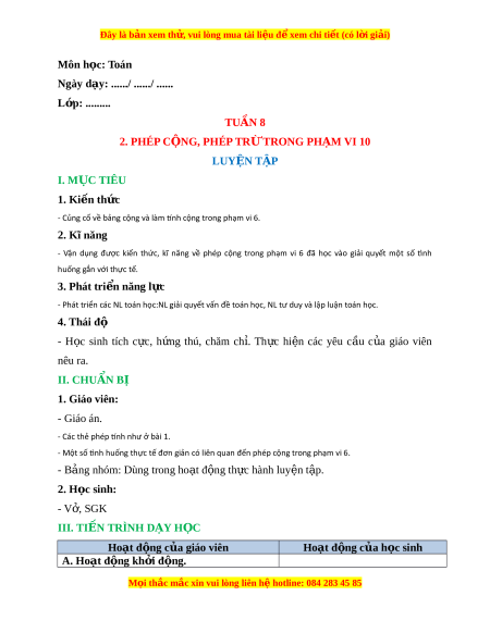 Ngày dạy: ....../ ....../ ...... L p: ớ ......... TUẦN 8 2. PHÉP C N Ộ G, PHÉP TR Ừ TRONG PH M Ạ VI 10 LUYỆN T P Ậ I. M C Ụ TIÊU 1. Ki n t ế h c ứ