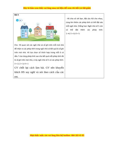 là số ghi trên mái nhà, ví dụ ngôi nhà số 5 có các phép tính: 3 + 2; 2 + 3; 4 + 1 GV ch t ố l i