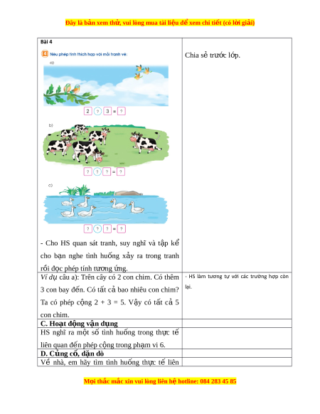 - Vận dụng được kiến thức, kĩ năng về phép cộng trong phạm vi 6 đã học vào giải quyết một số /nh