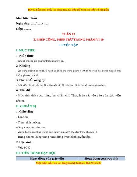Ngày dạy: ....../ ....../ ...... L p: ớ ......... TUẦN 13 2. PHÉP C N Ộ G, PHÉP TR Ừ TRONG PH M Ạ VI 10 LUYỆN T P Ậ I. M C Ụ TIÊU 1. Ki n t ế h c ứ
