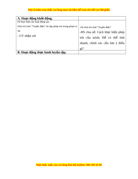 - Một số tình huống thực tế đơn giản có liên quan đến phép trừ trong phạm vi 10. - B ng ả nhóm: Dùng trong ho t ạ đ ng t ộ h c hành l ự uy n t ệ p. ậ 2. H c ọ sinh: - V , ở SGK III. TI N Ế TRÌNH D Y Ạ H C Ọ Hoạt đ ng c ộ a gi ủ áo viên Hoạt đ ng c ộ a h ủ c s ọ inh M i