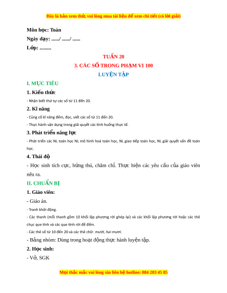 Ngày dạy: ....../ ....../ ...... L p: ớ ......... TUẦN 20 3. CÁC S Ố TRONG PH M Ạ VI 100 LUYỆN T P Ậ I. M C Ụ TIÊU 1. Ki n t ế h c ứ