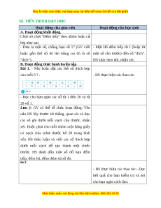 Đây là bản xem th , vu ử i lòng mua tài li u ệ đ xe ể m chi ti t (c ế ó l i ờ gi i ả ) III. TI N Ế TRÌNH D Y Ạ H C Ọ Hoạt đ ng c ộ a gi ủ áo viên Hoạt đ ng c ộ a h ủ c s ọ inh A. Hoạt đ ng k ộ h i ở đ ng. ộ Ch i ơ trò ch i ơ “Đ m ế ti p” ế theo nhóm ho c ặ cả l p nh ớ ư sau: - Đ a ư ra m t ộ s , ố ch ng ẳ h n ạ số 17 (GV vi t ế - M t ộ HS đ m ế ti p ế từ 1 (ho c ặ từ ho c ặ g n ắ thẻ số đó lên b ng ả coi đó là số m t ộ số cho trư c) ớ đ n ế số “đích”. “đích”). HS khác theo dõi, nh n ậ xét. B. Hoạt đ ng t ộ h c hành l ự uy n t ệ p ậ Bài 1. - Nêu ho c ặ đ t ặ các thẻ số thích h p ợ vào mỗi ô ? . - HS th c ự hi n các ệ thao tác: - Đ c ọ cho b n ạ nghe các số từ 1 đ n ế 20 và từ 20 v 1. ề L u