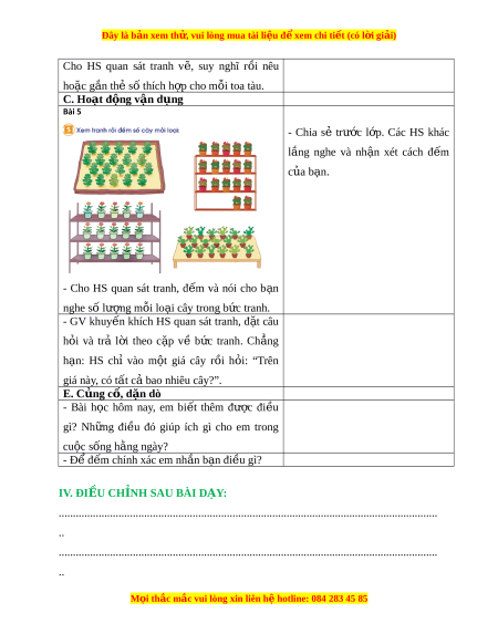 Đây là bản xem th , vu ử i lòng mua tài li u ệ đ xe ể m chi ti t (c ế ó l i ờ gi i ả ) Cho HS quan sát tranh v , ẽ suy nghĩ r i ồ nêu ho c ặ g n t ắ hẻ số thích h p ợ cho m i ỗ toa tàu. C. Hoạt đ ng v ộ n d ậ ng ụ Bài 5 - Chia sẻ trư c ớ l p. ớ Các HS khác l ng ắ nghe và nh n ậ xét cách đ m ế c a b ủ n. ạ - Cho HS quan sát tranh, đ m ế và nói cho b n ạ nghe số lư ng m ợ i ỗ lo i ạ cây trong b c t ứ ranh. - GV khuy n