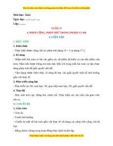 Ngày dạy: ....../ ....../ ...... L p: ớ ......... TUẦN 27 4. PHÉP C N Ộ G, PHÉP TR Ừ TRONG PH M Ạ VI 100 LUYỆN T P Ậ I. M C Ụ TIÊU 1. Ki n t ế h c ứ - Th c ự hi n đ ệ ư c ợ c ng, h ộ ừ các phép tính d ng ạ 14 + 3 và d ng 17- ạ 2. 2. Kĩ năng - Nh n ậ bi t ế bài toán có l i ờ văn g m ồ các số (đi u ề đã bi t ế ) và câu h i ỏ (đi u ề c n ầ tìm). N m ắ b t ắ đư c ợ thông tin toán h c ọ h u ữ ích trong m i ỗ bài toán và l a ự ch n ọ đúng phép tính đ gi ể i ả quy t ế v n đ ấ . ề - V n ậ d ng ụ đư c ợ ki n ế th c, ứ kĩ năng đã h c ọ vào gi i ả quy t ế m t ộ số tình hu ng ố g n ắ v i ớ th c t ự . ế 3. Phát tri n nă ể ng l c ự - Phát tri n các ể NL toán h c: ọ NL giao ti p t ế oán h c, ọ NL gi i ả quy t ế v n đ ấ . ề 4. Thái độ - H c ọ sinh tích c c, ự h ng ứ thú, chăm ch .ỉ Th c ự hi n ệ các yêu c u ầ c a ủ giáo viên nêu ra. II. CHUẨN BỊ 1. Giáo viên: - Giáo án. - Tranh tình huống. - Chuẩn bị m t ộ số bài toán g n ắ v i ớ th c ự tế sử d ng ụ các phép tính c ng, ộ trừ đã h c. ọ - B ng ả nhóm: Dùng trong ho t ạ đ ng t ộ h c hành l ự uy n t ệ p. ậ M i