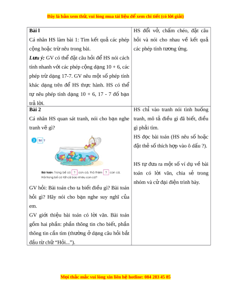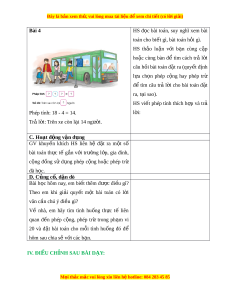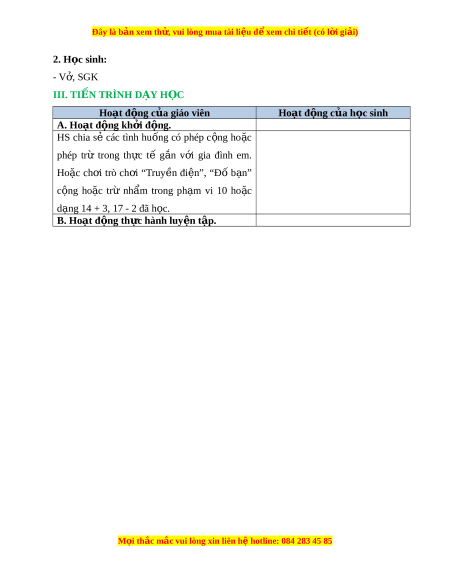 Đây là bản xem th , vu ử i lòng mua tài li u ệ đ xe ể m chi ti t (c ế ó l i ờ gi i ả ) 2. H c ọ sinh: - V , ở SGK III. TI N Ế TRÌNH D Y Ạ H C Ọ Hoạt đ ng c ộ a gi ủ áo viên Hoạt đ ng c ộ a h ủ c s ọ inh A. Hoạt đ ng k ộ h i ở đ ng. ộ HS chia sẻ các tình hu ng ố có phép c ng ộ ho c ặ phép trừ trong th c ự tế g n ắ v i ớ gia đình em. Hoặc ch i ơ trò ch i ơ “Truy n ề đi n”, ệ “Đố b n” ạ c ng ộ ho c ặ trừ nh m ẩ trong ph m ạ vi 10 ho c ặ d ng ạ 14 + 3, 17 - 2 đã h c. ọ B. Hoạt đ ng t ộ h c hành l ự uy n t ệ p. ậ M i