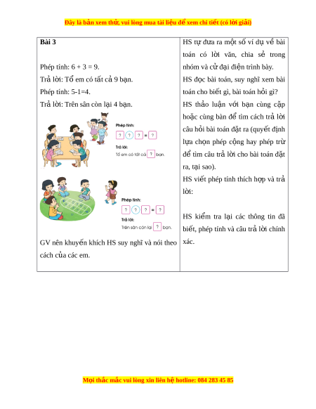 Đây là bản xem th , vu ử i lòng mua tài li u ệ đ xe ể m chi ti t (c ế ó l i ờ gi i ả ) Bài 3 HS tự đ a ư ra m t ộ số ví dụ về bài toán có l i ờ văn, chia sẻ trong Phép tính: 6 + 3 = 9. nhóm và c đ ử i ạ đi n t ệ rình bày. Tr l ả i ờ : Tổ em có t t ấ c 9 b ả n. ạ HS đ c