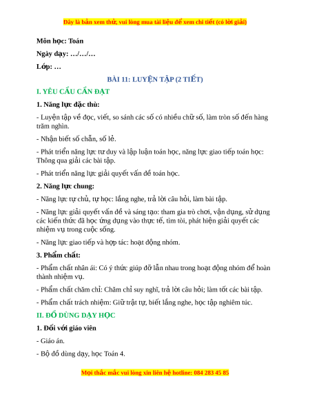 I. YÊU CẦU CẦN ĐẠT 1. Năng l c đ ự c t ặ hù: - Luyện t p ậ v đ ề c, vi ọ t ế , so sánh các s có nhi ố u ch ề ữ s , l ố àm tròn s đ ố n ế hàng trăm nghìn. - Nh n bi ậ t ế số ch n, s ẵ ố l . ẻ - Phát tri n năng ể l c t ự duy và l ư p l ậ u n ậ toán h c, năng ọ l c gi ự ao ti p t ế oán h c: ọ Thông qua gi i ả các bài t p. ậ - Phát tri n năng ể l c gi ự i ả quy t ế v n đ ấ t ề oán h c. ọ 2. Năng l c chung ự : - Năng l c t ự ch ự , ủ t h ự c: ọ l ng ắ nghe, tr l ả i ờ câu h i ỏ , làm bài t p. ậ - Năng l c gi ự i ả quy t ế v n đ ấ và s ề áng t o: ạ tham gia trò ch i ơ , v n d ậ ng, ụ sử d ng ụ các ki n t ế h c đã h ứ c ọ ng d ứ ng vào t ụ h c t ự , ế tìm tòi, phát hi n gi ệ i ả quy t ế các nhiệm v t ụ rong cu c s ộ ống. - Năng l c gi ự ao ti p và ế h p t ợ ác: ho t ạ đ ng ộ nhóm. 3. Phẩm ch t ấ : - Ph m ẩ ch t ấ nhân ái: Có ý th c gi ứ úp đ l ỡ n nhau t ẫ rong ho t ạ đ ng nhóm ộ đ hoàn ể thành nhi m ệ v . ụ - Ph m ẩ ch t ấ chăm ch : ỉ Chăm ch s ỉ uy nghĩ, tr l ả i ờ câu h i ỏ ; làm t t ố các bài t p. ậ - Ph m ẩ ch t ấ trách nhi m ệ : Gi t ữ r t ậ t , bi ự t ế l ng nghe, h ắ c ọ t p nghi ậ êm túc. II. Đ D Ồ ÙNG D Y Ạ H C Ọ 1. Đ i ố v i ớ giáo viên - Giáo án. - Bộ đồ dùng d y ạ , h c ọ Toán 4. M i