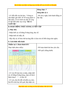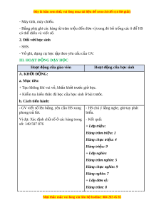 Đây là bản xem th , vu ử i lòng mua tài li u ệ đ xe ể m chi ti t (c ế ó l i ờ gi i ả ) - Máy tính, máy chi u. ế - B ng ả ph ghi ụ các hàng t t ừ răm tri u đ ệ n ế đ n v ơ t ị rong đó b t ỏ r ng các ô đ ố H ể S có thể đi n ề và vi t ế s . ố 2. Đ i ố v i ớ h c s ọ inh - SHS. - Vở ghi, d ng c ụ h ụ c ọ t p t ậ heo yêu c u c ầ a ủ GV. III. HOẠT Đ N Ộ G D Y Ạ H C Ọ Hoạt đ ng c ộ a gi ủ áo viên Hoạt đ ng c ộ a h ủ c s ọ inh A. KH I Ở Đ N Ộ G: a. Mục tiêu: + T o không khí ạ vui v , kh ẻ n kh ấ i ở trư c ớ gi h ờ c. ọ + Ki m ể tra ki n ế th c ứ đã h c c ọ a ủ h c s ọ inh bài ở trư c. ớ b. Cách ti n hành ế : - GV vi t ế số lên b ng, ả yêu c u H ầ S xung - HS chú ý l ng nghe, ắ giơ tay phát phong trả l i ờ . bi u. ể Ví d : ụ Xác đ nh ch ị s ữ ố các hàng t ở rong - K t ế qu : ả số: 149 597 876 + L p t ớ ri u: ệ