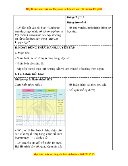 ứ này trong “Bài 11: Luy n t ệ ập”. B. HO T Ạ Đ N Ộ G TH C Ự HÀNH, LUY N Ệ T P Ậ a. Mục tiêu: - Nh n ậ bi t ế các số đ ng ứ t ở ng hàng, đ ừ c ọ s . ố - Nh n ậ bi t ế s ch ố n, ẵ l . ẻ - S p ắ x p các s ế ố theo th t ứ t ự ăng d n và l ầ àm tròn s đ ố n ế hàng trăm nghìn. b. Cách th c t ứ i n hành ế Nhi m ệ v 1