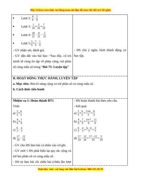 a. Mục tiêu: Rèn kĩ năng cộng và trừ phân số có cùng mẫu số.